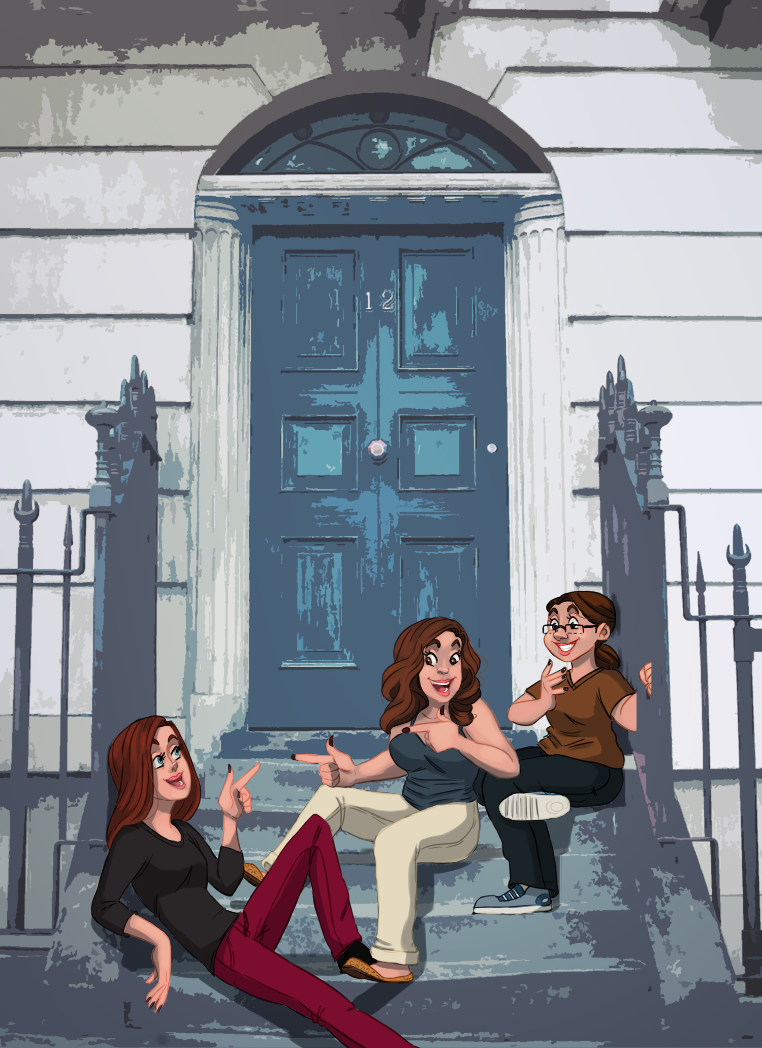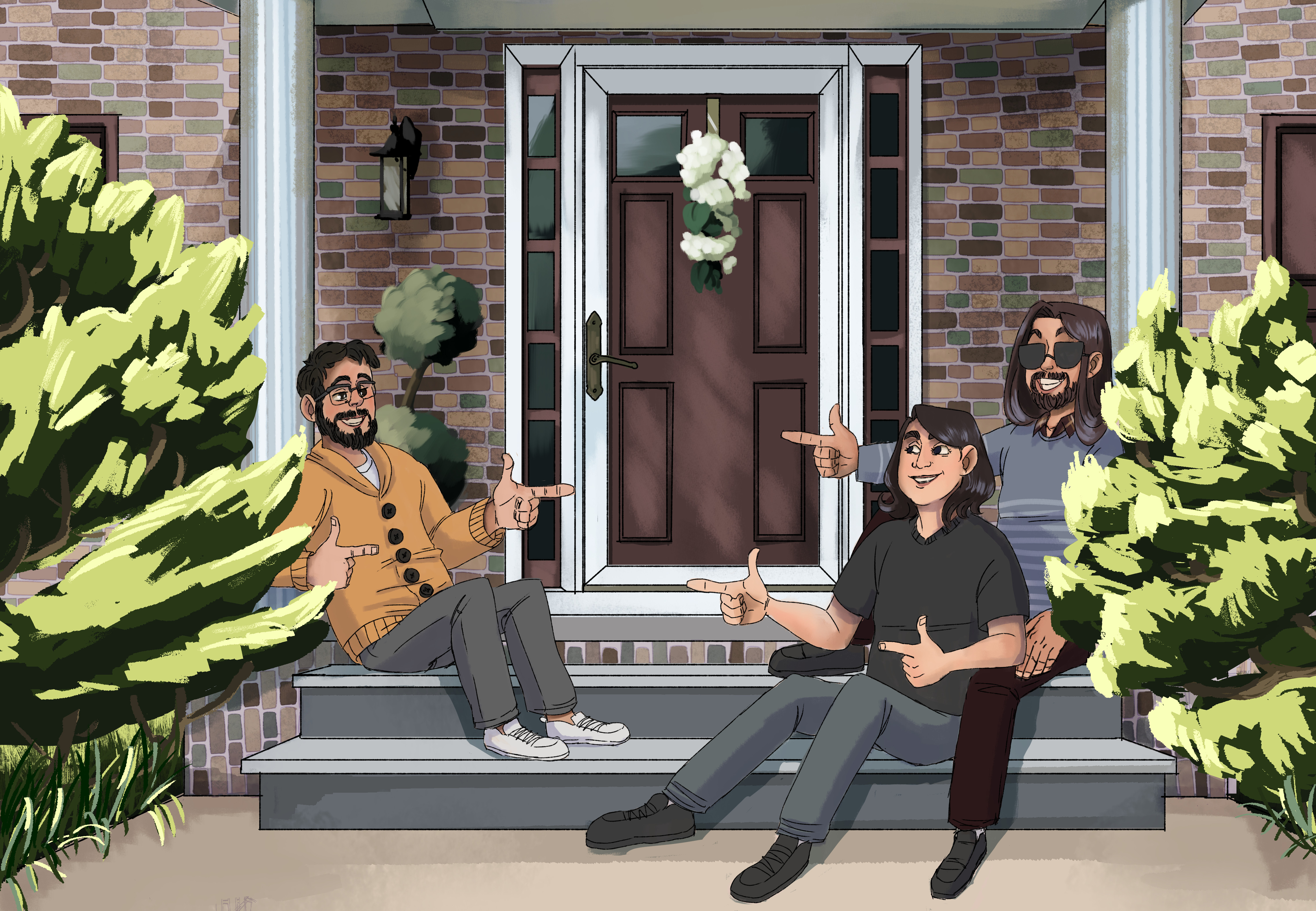 Process: In Clip Studio Paint I drew a rough sketch of both groups in front of requested locations. After feedback, I made edits, cleaned up the line art, and colored the illustration.